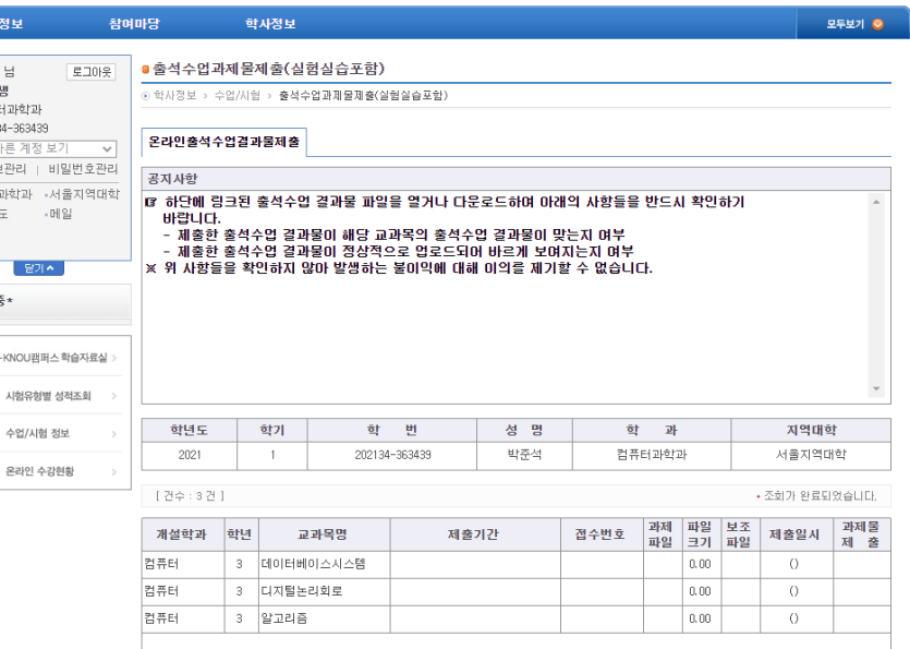 출석수업관련과제물제출PAGE에 내용이 비어있습니다. 페이지 정보 작성자 박준석 댓글 1건 조회 6,922회 작성일 21-04-07 00:08 본문 위와 같이 나오는건 아직 출석수업관련 과제물이 정해지지 않았다는 의미인거죠? 참고로 서울지역대학입니다.(뚝섬역근처) 목록 글쓰기 이전글웹캠이 없이 PC로 화상강의출석은 불가능한가요? 21.04.13 다음글출석화상강의와기말시험온라인평가란? 21.04.02 댓글목록 댓글목록 홍엽님의 댓글 홍엽 작성일 21-04-07 13:52 안녕하세요 홍엽회장입니다. 3학년 뚝섬 출석수업은 5월 9일부터 5월 10일까지 이틀에 걸쳐서 진행되며, 출석수업이 끝난 후에 과제물을 작성하시고 제출하시면 됩니다.(과제물은 출석수업이 끝난 후에 공개됩니다.) 답변 삭제 안녕하세요 홍엽회장입니다. 3학년 뚝섬 출석수업은 5월 9일부터 5월 10일까지 이틀에 걸쳐서 진행되며, 출석수업이 끝난 후에 과제물을 작성하시고 제출하시면 됩니다.(과제물은 출석수업이 끝난 후에 공개됩니다.)